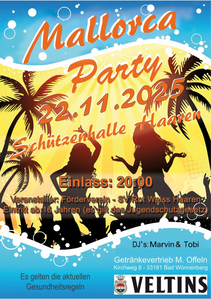 Am 22.11.2025 findet bereits zum 29-ten Mal die zur Tradition gewordene Mallorca-Party in der Schützenhalle Haaren statt. Auch in diesem Jahr wird das besondere Flair des Ballermann und der Schinkenstraße Einzug in Haaren halten. Neben der großer Longdrinkbar und mehreren Biertheken, können sich die Partygäste mit Sangria, guter Stimmung, gemütlicher Atmosphäre und bestem Service verwöhnen lassen. Unterstützt werden wir dabei wieder von unserem DJ-Team @nmn_marvin und @tobiii_go . Der Samstag vor Totensonntag hat sich als fester Bestandteil eines jeden Terminkalenders auch über die Grenzen des Hochstifts hinaus etabliert. Einlass ist ab 20:00 Uhr. Es gelten die Jugendschutzbestimmungen sowie die aktuellen Gesundheitsregeln.