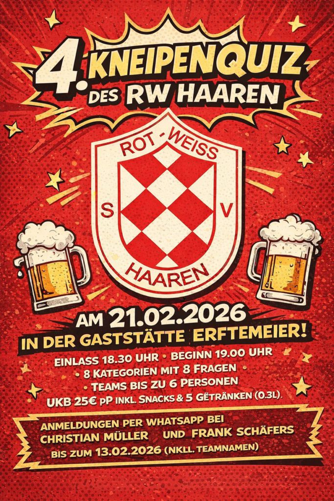 Am 21.02.2026 ist es wieder soweit. Wir präsentieren die 4. Auflage unseres Kneipenquiz in unserem Vereinslokal Erftemeier. Startschuss ist um 19 Uhr. Bei einem Unkostenbeitrag von 25€ ist für Snacks und 5 Freigetränke (0,3L) gesorgt. Unsere Quizmaster @markvandeneeckhout und Werner haben sich wieder 8 Kategorien mit jeweils 8 Fragen ausgesucht, mit denen sie die Temas von jeweils maximal sechs Personen testen wollen. Für die passende Unterhaltung wird also wieder gesorgt sein. Bitte meldet euch bis zum 13.02.2026 bei @christianmuller829 oder Frank an.